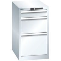 Szafki warsztatowe Lista z szufladami, 3 lub 5 szufladami. Zamek na klucz. Optymalne wykorzystanie dzięki pełnemu wysuwowi i optymalnej wysokości frontu szuflady. Doskonała ochrona przed kurzem, cieczami i uszkodzeniami mechanicznymi dzięki zamkniętej ramie z powierzchnią odporną na uderzenia i ścieranie. System zabezpieczający przed wypadnięciem szuflady oraz blokada każdej szuflady osobno. Ochrona antykorozyjna poprzez elektroforetyczne malowanie zanurzeniowe i natryskiwanie. Zoptymalizowana przestrzeń do przechowywania i organizacja dzięki przegródkom LISTA dostosowanym do każdego zastosowania oraz szufladom wyposażonym w rowki i perforacje. Profesjonalne etykietowanie z oprogramowaniem LISTA Script i odchylanym uchwytem na etykiety. Idealnie cichy ruch dzięki prowadnicy bez poprzeczki. Przegródki do szuflad nie są dołączone. Należy je zakupić osobno.