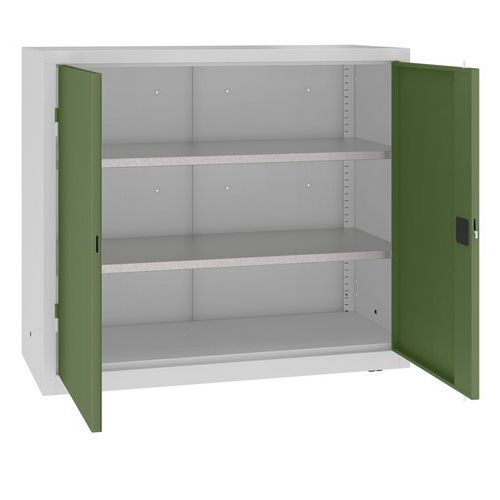 - Niskie metalowe szafki z dwiema półkami, przeznaczone do profesjonalnego użytku w suchych i wentylowanych pomieszczeniach wewnętrznych.