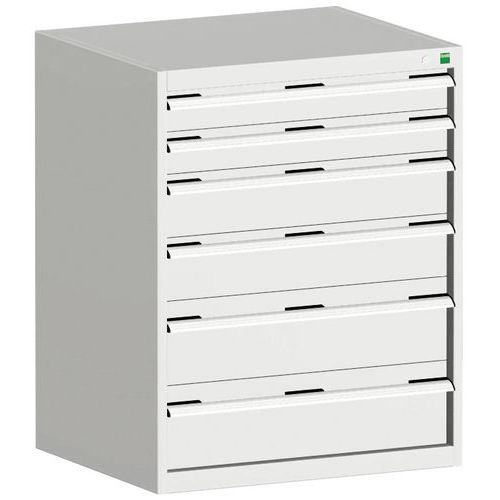 Szafki szufladowe Bott Cubio z szufladami o nośności 75 kg i 100% wysuwem na łożyskach rolkowych. Solidna, spawana konstrukcja stalowa o nośności do 1,5 tony, malowana proszkowo. System centralnego zamka i blokady otwarcia kilku szuflad jednocześnie. Ergonomiczne uchwyty z listwą opisową, zamykane na zamek patentowy z dwoma kluczami. Maks. obciążenie (kg) : 1500 kg