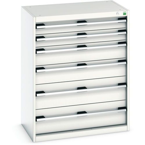 Szafki szufladowe Bott Cubio z szufladami o nośności 75 kg i 100% wysuwem na łożyskach rolkowych. Solidna, spawana konstrukcja stalowa o nośności do 1,5 tony, malowana proszkowo. System centralnego zamka i blokady otwarcia kilku szuflad jednocześnie. Ergonomiczne uchwyty z listwą opisową, zamykane na zamek patentowy z dwoma kluczami.