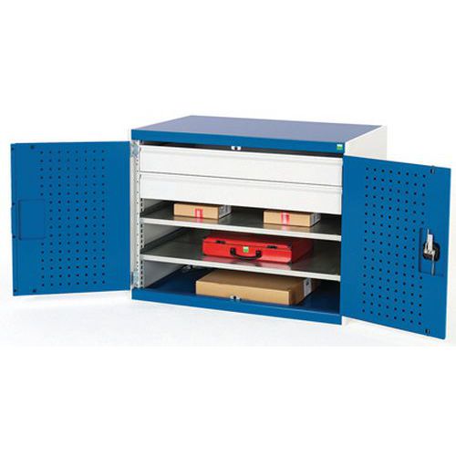 - Wzmocnione drzwi skrzydłowe z perforowaną stroną wewnętrzną do przechowywania narzędzi.