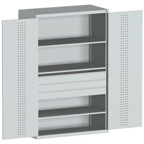 - Wzmocnione drzwi skrzydłowe z perforowaną stroną wewnętrzną do przechowywania narzędzi.