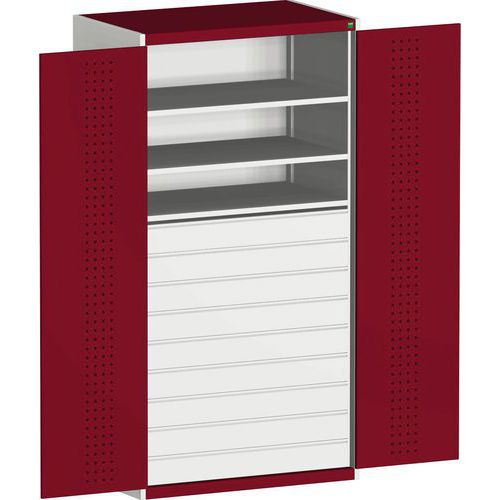Szafka warsztatowa z szufladami Bott Cubio 160, 200 x 130 x 65 cm, 3 półki, 9 szuflad, szaro-czerwony