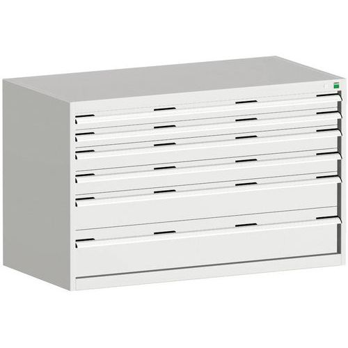 - Szafki szufladowe Bott Cubio z szufladami o nośności 75 kg i 100% wysuwem na łożyskach rolkowych.
