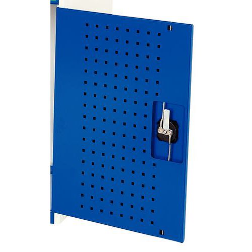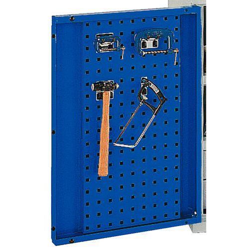 Wisząca szafka metalowa z perforacją i kompletem uchwytów na narzędzia. Tył szafki oraz wewnętrzna część drzwi wyposażona w perforowane panele do mocowania uchwytów na narzędzia (typu perfo). Solidna spawana konstrukcja stalowa o nośności do do 1 tony, powierzchnia malowana proszkowo. . Zamknięcie na zamek bębenkowy z dwoma kluczami. Zestaw 20 uchwytów narzędziowych zawiera: 1 x uchwyt na klucz imbusowy, 1 x uchwyt wkrętaków, 1 x uchwyt na wiertarkę, 1 x uchwyt na klucz, 1 x uchwyt na piłę, 5 x podwójny hak Ř6 x 75 mm, 5 x zacisk na narzędzia Ř 13 mm, 5 x pojedynczy hak Ř6 x 25 mm. Zestaw 40 uchwytów do narzędzia obejmują: 1 x uchwyt na klucz imbusowy, 1 x uchwyt na śrubokręt, 1 x uchwyt na wiertarkę, 1 x uchwyt na klucz, 1 x uchwyt na piłę, 5 x podwójny hak Ř6 x 150 mm, 5 x podwójny hak Ř6 x 75 mm, 5 x zacisk narzędziowy Ř 13 mm, 5 x zacisk narzędziowy Ř 25 mm, 5 x pojedynczy hak Ř6 x 25 mm, 5 x pojedynczy hak Ř6 x 50 mm, 5 x uchwyt na szczypce ze śr. 55 mm.