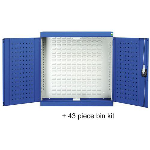 Wisząca szafka metalowa z perforacją i zestawem plastikowych pudełek do przechowywania narzędzi. Perforowany panel tylny szafy do zawieszania plastikowych skrzynek (typ rasterowy) i drzwi szafki z perforowaną stroną wewnętrzną do umieszczenia uchwytów na narzędzia (typ perfo). Wytrzymała stal spawana konstrukcja o nośności do 1 tony, malowana proszkowo. Zamek bębenkowy z dwoma kluczami. Zestaw 23 pudełek zawiera 20 sztuk x plastikowe pudełko nr. 2 (wys. x szer. x gł.) 8,3 x 10,3 x 16,5 cm: 5 x żółty, 10 x czerwony, 5 x niebieski i plastikowe pudełko nr 2 3 (wys. x szer. x gł.) 12,5 x 14,5 x 24 cm: 3 x żółte. Zestaw 33 pudełek zawiera 28 x plastikowe pudełko nr. 2 (wys. x szer. x gł.) 8,3 x 10,3 x 16,5 cm: 7 x żółty, 7 x czerwony, 14 x niebieski i plastikowe pudełko nr 2 3 (wys. x szer. x gł.) 12,5 x 14,5 x 24 cm: 5 x żółty. Zestaw 43 pudełek zawiera 28 x plastikowe pudełko nr. 2 (wys. x szer. x gł.) 8,3 x 10,3 x 16,5 cm: 7 x żółty, 7 x czerwony, 14 x niebieski i 15 x plastikowe pudełko