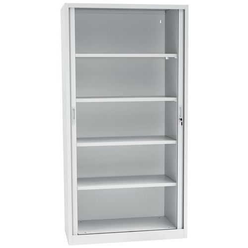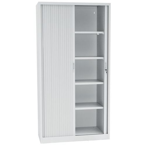 Szafa z czterema półkami przestawnymi i plastikowymi roletami, które można w całości wsunąć do ścian bocznych.