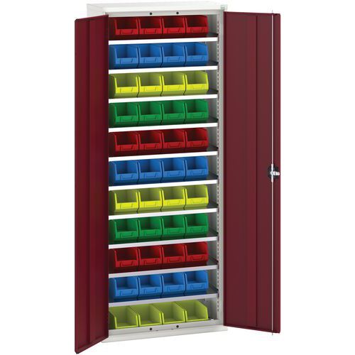 Szafka Bott Verso z pudełkami, 200 x 80 x 35 cm, 10 półek, 44 pudełka, szaro-czerwona