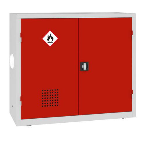 Niskie metalowe szafy do przechowywania chemikaliów.