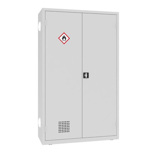Drzwi wahadłowe posiadają otwory wentylacyjne zapewniające cyrkulację powietrza oraz są oznaczone etykietą GHS-02 służącą do identyfikacji standardowych zagrożeń chemicznych.