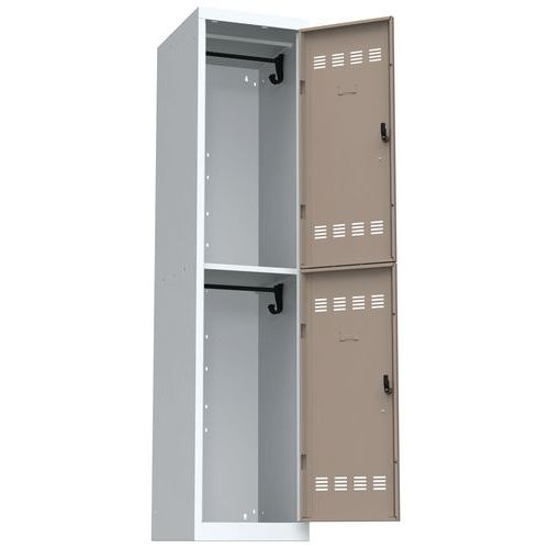 Wieloprzedziałowa szafa na ubrania o konstrukcji spawanej, z blachy stalowej o grubości 0,7 mm. Każdy przedział jest wyposażony pręt na wieszaki oraz dwa haczyki (zamknięcie na zamek obrotowy na kłódkę – brak w zestawie). Perforowane drzwiczki zapewniają skuteczną wentylację części wewnętrznej. Możliwość umieszczenia etykiety z nazwiskiem.