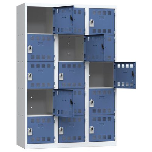 Szafa szatniowa Vinco, o konstrukcji spawanej, 3 słupki, 15 boksów, 400 mm, zamek obrotowy, szara/niebieska Szafa szatniowa Vinco, o konstrukcji spawanej, 3 słupki, 15 boksów, 400 mm, zamek obrotowy, szara/niebieska