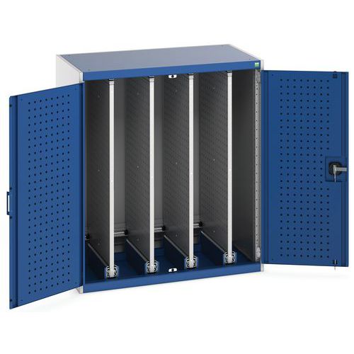 - Szafy warsztatowe z czterema wysuwanymi panelami perforowanymi obustronnie z pełnym wysuwem do elastycznego wieszania narzędzi.