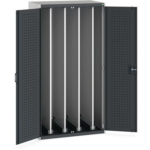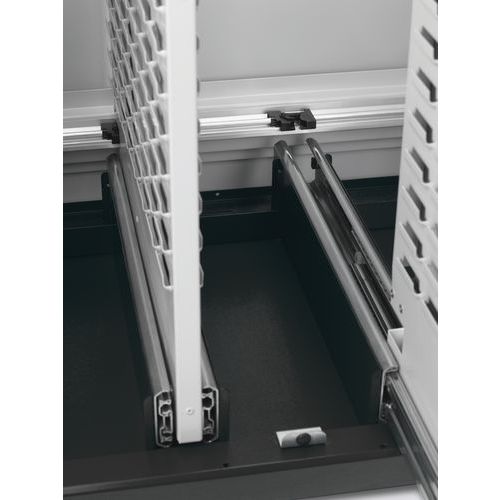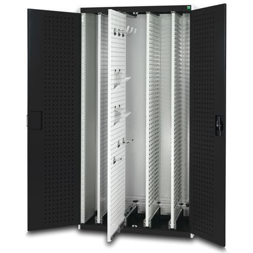 - Szafy warsztatowe z czterema wysuwanymi panelami perforowanymi obustronnie z pełnym wysuwem do elastycznego wieszania narzędzi.