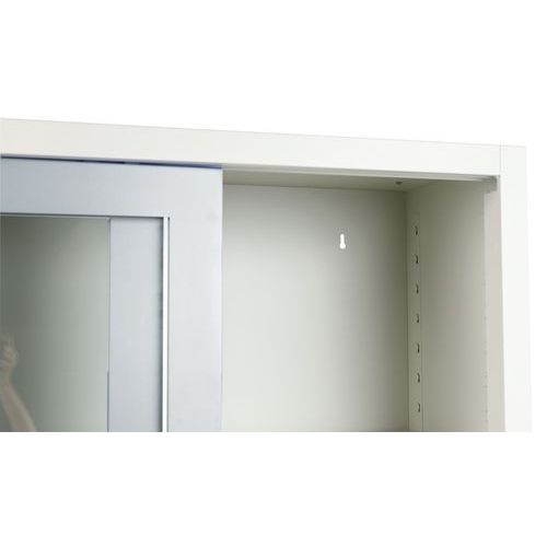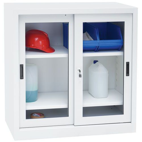 Niskie metalowe szafki z przeszklonymi drzwiami przesuwnymi nadają się do biura, laboratorium, zakładów warsztatowych oraz placówek służby zdrowia. Szafki o konstrukcji z blachy stalowej wyposażone są w dwie półki, których wysokość położenia można w razie potrzeby wyregulować. Drzwi zamykane na zamek cylindryczny.