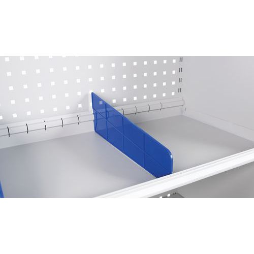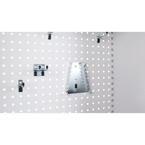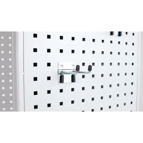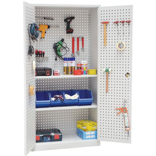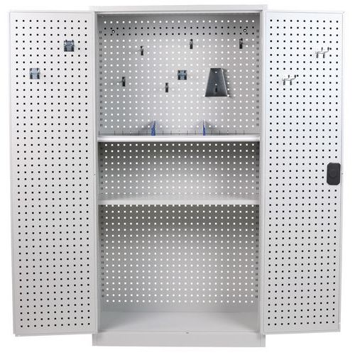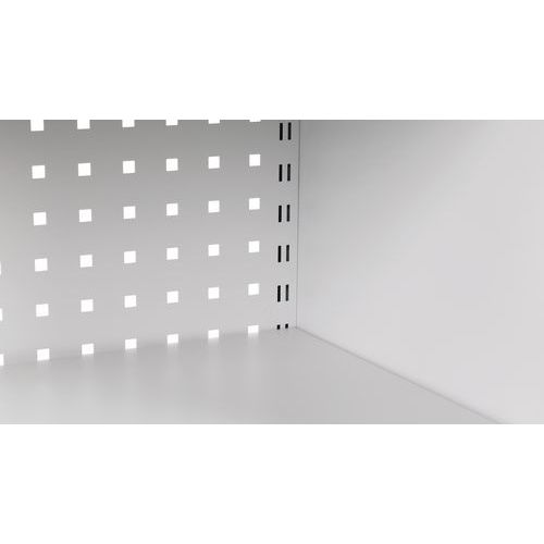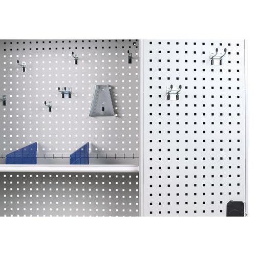 Szafy warsztatowe z dwiema półkami wykonane z blachy stalowej. W tylnej części szaf metalowych i drzwi umieszczono płyty perforowane, które umożliwiają zamocowanie uchwytów na narzędzia oraz pojemniki. Szafy blaszane można zamknąć na zamek cylindryczny z dwupunktowym mechanizmem ryglującym. Kąt otwarcia drzwi wynosi 180 °. Półki przestawne w zakresie 3,6 cm. Stopki poziomujące do niwelowania nierówności podłoża.