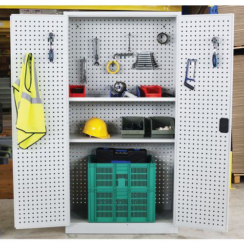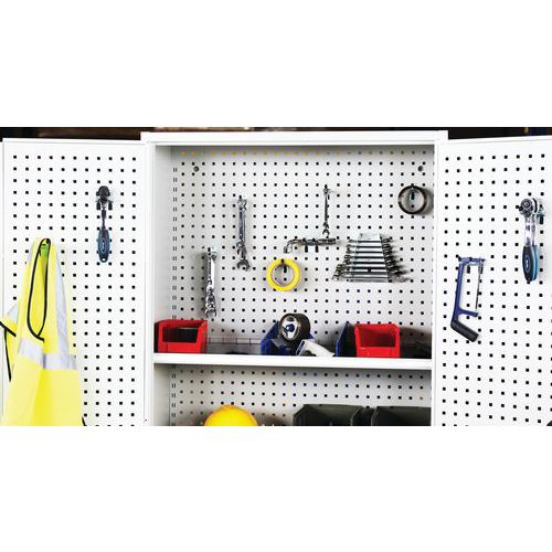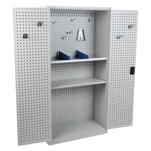 Szafy warsztatowe z dwiema półkami wykonane z blachy stalowej. W tylnej części szaf metalowych i drzwi umieszczono płyty perforowane, które umożliwiają zamocowanie uchwytów na narzędzia oraz pojemniki. Szafy blaszane można zamknąć na zamek cylindryczny z dwupunktowym mechanizmem ryglującym. Kąt otwarcia drzwi wynosi 180 °. Półki przestawne w zakresie 3,6 cm. Stopki poziomujące do niwelowania nierówności podłoża. Maks. obciążenie półki (kg) : 60 kg Gwarancja producenta dla klienta : 10 lat