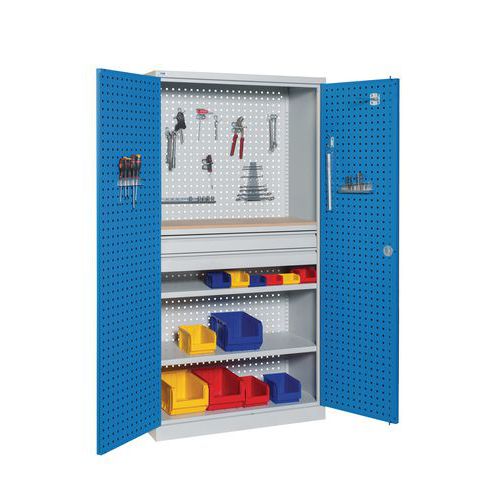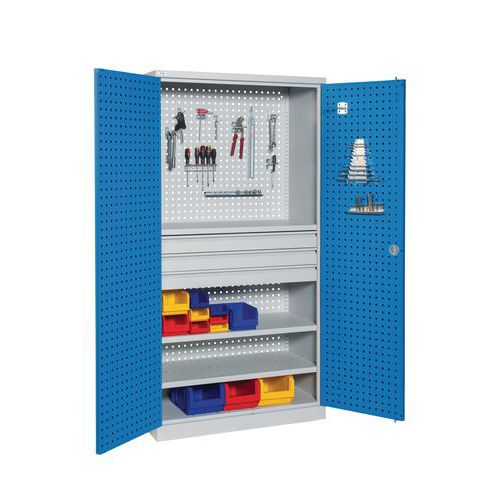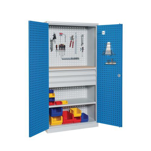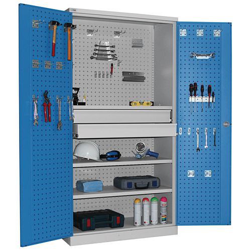 Szafa warsztatowa o konstrukcji spawanej, z w pełni wysuwanymi szufladami, z perforacją do mocowania narzędzi. Drzwi i plecy są perforowane, co umożliwia zawieszenie haczyków na narzędzia (kwadratowe otwory 10 x 10 mm, rozstaw 38 mm). Zamknięcie na dwupunktowy ryglowy zamek cylindryczny. Szafę można przymocować do ziemi za pomocą otworów montażowych.