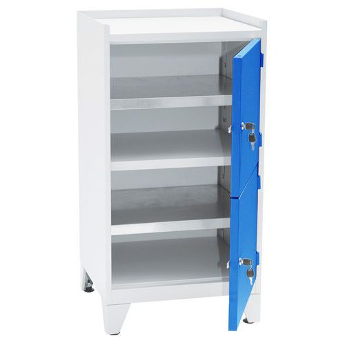 Szafki warsztatowe na zdejmowanych nóżkach z polipropylenu do stawiania na mokrym podłożu. Szafki wyposażone w górną 3-centymetrową krawędź ochronną i dwie wyjmowane półki o regulowanej wysokości.