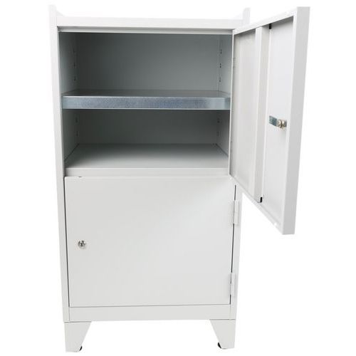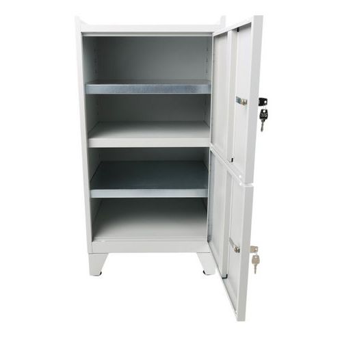 Szafki warsztatowe na zdejmowanych nóżkach z polipropylenu do stawiania na mokrym podłożu. Szafki wyposażone w górną 3-centymetrową krawędź ochronną i dwie wyjmowane półki o regulowanej wysokości.