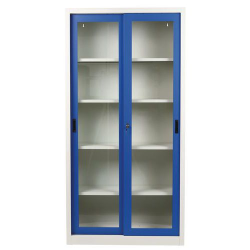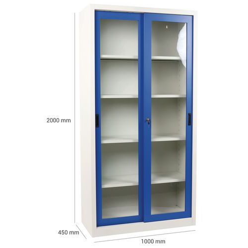 Szafy spawane z czterema półkami przestawnymi. Wykonane z blachy stalowej o gr. 0,9 mm. Drzwi przesuwne z okienkami z hartowanego szkła oszczędzają miejsce i umożliwiają natychmiastową orientację co do zawartości szafy. Zamykane na klucz – na zamek cylindryczny.
