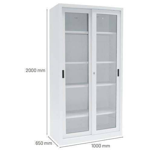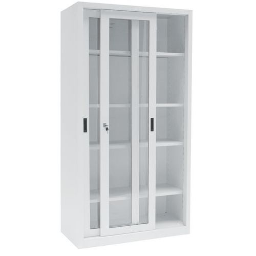 Szafy spawane z czterema półkami przestawnymi. Wykonane z blachy stalowej o gr. 0,9 mm. Drzwi przesuwne z okienkami z pleksiglasu oszczędzają miejsce i umożliwiają natychmiastową orientację co do zawartości szafy. Zamykane na klucz – na zamek cylindryczny.