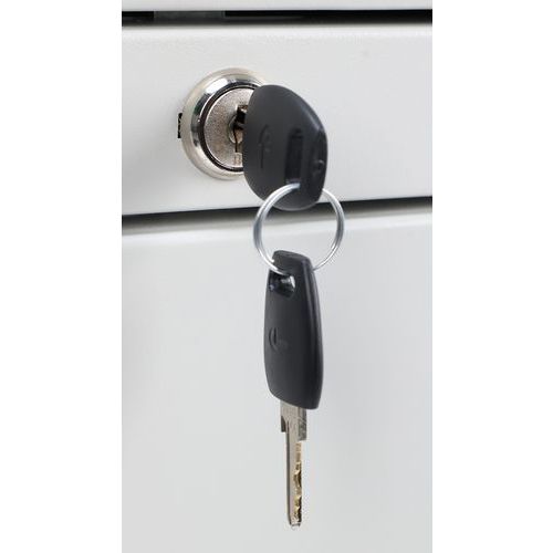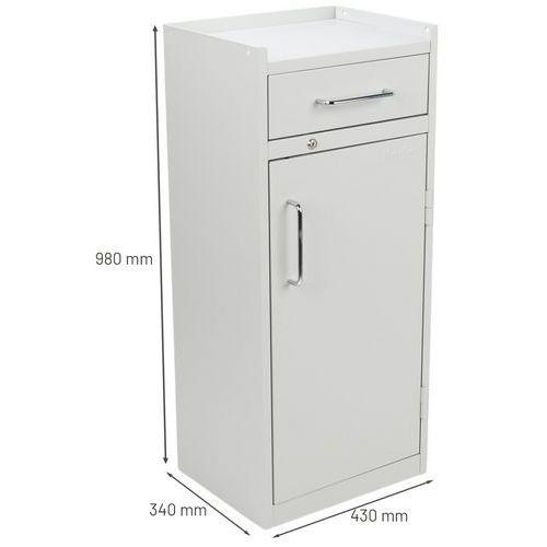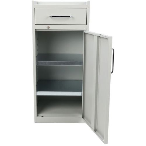 Niskie szafki warsztatowe z dwoma wyjmowanymi półkami o regulowanej wysokości. Szafki z 3-centrymentrową górną krawędzią ochronną. wymiary: wys. x szer. x gł.: 98 x 43 x 34 cm materiał: stal ocynkowana nośność na półkę: 40 kg liczba półek: 2 szt. liczba szuflad: 1 szt. kolor: szary kolor drzwi: niebieski, szary można zamknąć na klucz