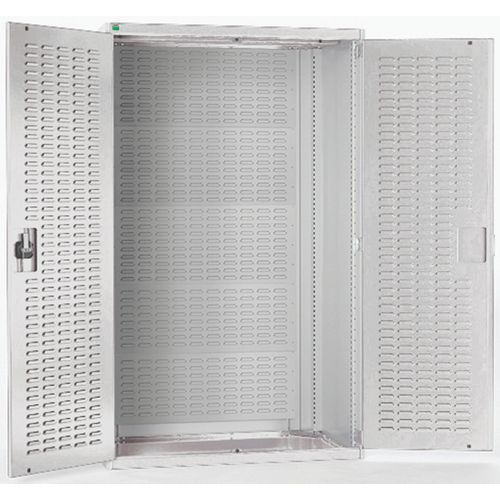 - Tylna ściana i wewnętrzne boki drzwi z perforacją do zawieszania skrzynek plastikowych.