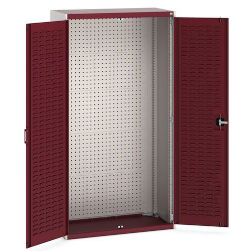 - Ściana tylna z perforacją do mocowania uchwytów na narzędzia oraz wewnętrzna strona drzwi do zawieszenia skrzynek plastikowych.