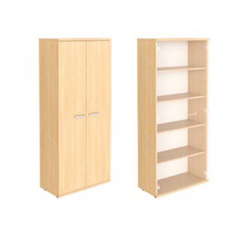 Szafa wysoka biurowa w dwóch wariantach kolorystycznych, z drzwiami i czterema półkami. Stopki regulacyjne umożliwiające dostosowanie wysokości do dostawki.