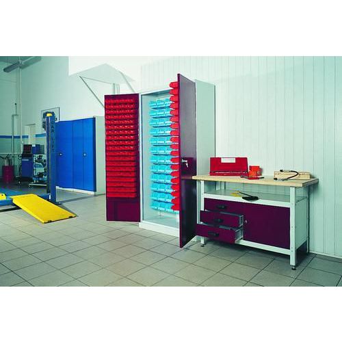 Spawana szafa z pojemnikami z tworzywa sztucznego i drzwiami wykonana z blachy stalowej wysokiej jakości. Skrzydła drzwiowe zostały wyposażone we wzmocnione profile zwiększające wytrzymałość i odporność na wyłamanie. Możliwość dowolnej regulacji pudełek w odstępach co 2,5 cm. Wymiary pudełek małych wys. x sz. x gł.: 5,6 x 7,7 x 11,9/9 cm. Nośność pudełek 3 kg. Wymiary pudełek duzych wys. x sz. x gł.: 10,8 x 14,4 x 24,4/17 cm. Nośność pudełek 0,2 kg. Ilość pudełek małych: 160 szt. Ilość pudełek duzych: 72 szt.