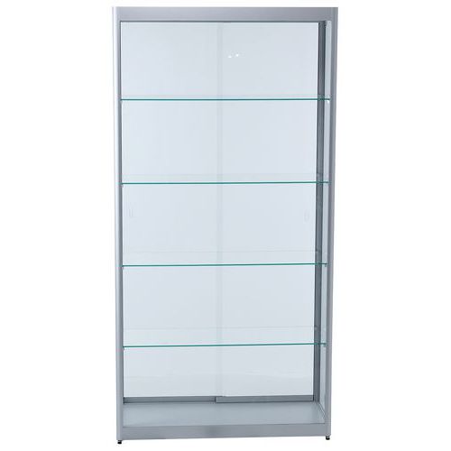 Oszklona gablota produktowa do prezentacji towaru. Wyposażona w cztery regulowane półki szklane o nośności maksymalnej 8 kg na półkę. Drzwi przesuwne ze szkła hartowanego gr. 6 mm z zamkiem. 2x oświetlenie LED (ciepły biały) w listwie górnej. Regulowane nóżki do niwelowania nierówności.