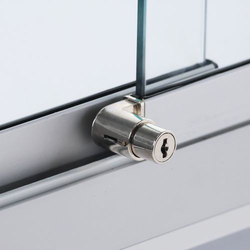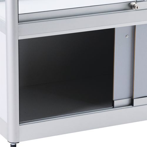 Oszklona gablota produktowa do prezentacji towaru, z obszarem do przechowywania przedmiotów w części dolnej. Wyposażona w trzy regulowane półki szklane o nośności maksymalnej 8 kg na półkę. Drzwi przesuwne ze szkła hartowanego gr. 6 mm z zamkiem. 2x oświetlenie LED (ciepły biały) w listwie górnej. Szafka z drzwiami przesuwnymi zamykanymi na klucz. Regulowane nóżki do niwelowania nierówności.