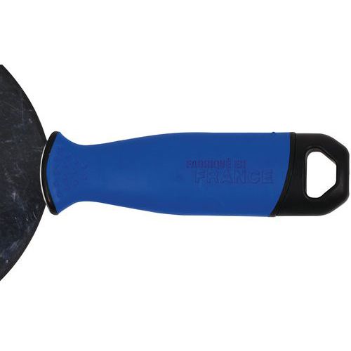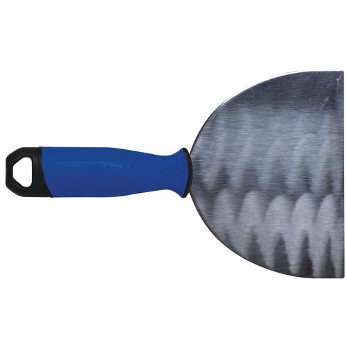 Szpachelka ze stali nierdzewnej, wyposażona w rączkę wykonaną z dwóch materiałów.