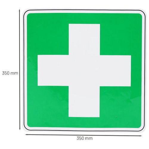 Znaki bezpieczeństwa z symbolem pierwszej pomocy, które pomogą Ci szybko znaleźć potrzebny sprzęt ratunkowy.