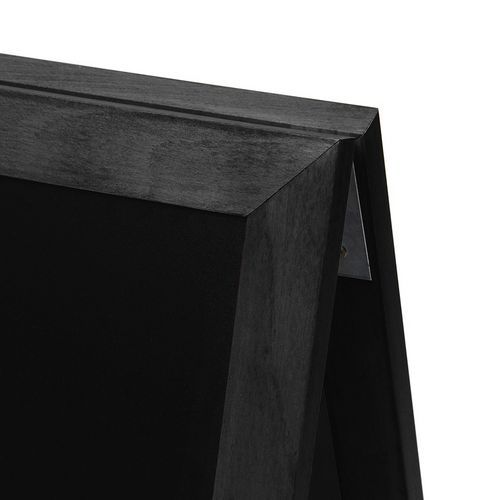 Reklamowe tablice kredowe typu A, z wysokiej jakości twardego drewna bukowego oraz czarnej laminowanej płyty wiórowej. Dzięki lakierowi ochronnemu i powłoce ze stabilnych farb UV nadają się także do użytku zewnętrznego. Łatwą manipulację zapewniają zawiasy ze stali galwanizowanej. Nadają się do użytku w restauracjach oraz bistrach. Wyprodukowany w UE