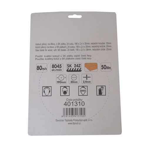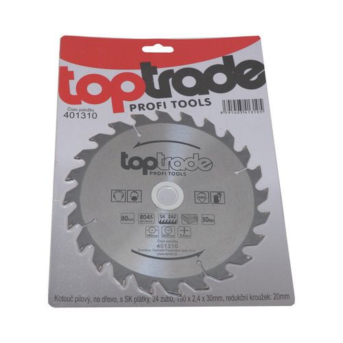 | Nazwa produktu | Tarcza do piły TOPTRADE, do drewna, z płytkami widiowymi, 24 zęby, 190 x 2,4 x 30/20 mm |