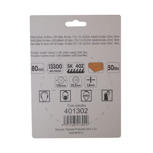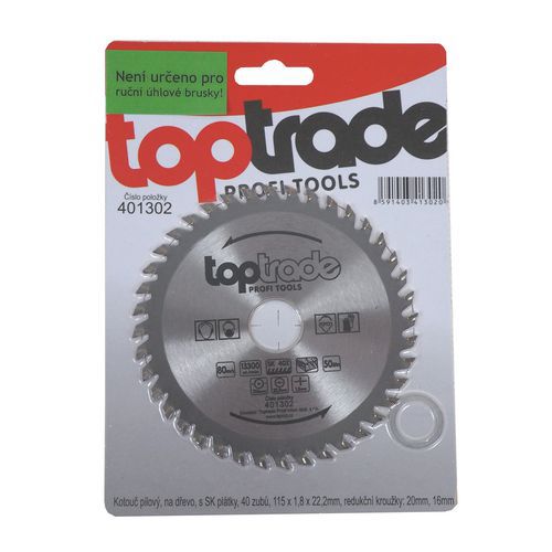 | Nazwa produktu | Tarcza do piły TOPTRADE, do drewna, z płytkami widiowymi, 40 zębów, 115 x 1,8 x 22,2/20/16 mm |