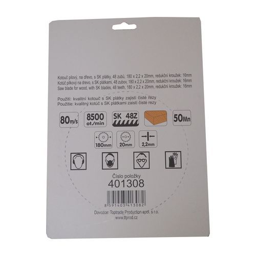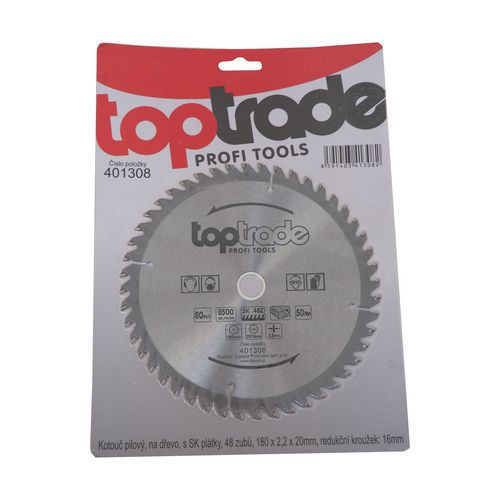 | Nazwa produktu | Tarcza do piły TOPTRADE, do drewna, z płytkami widiowymi, 48 zębów, 180 x 2,2 x 20/16 mm |