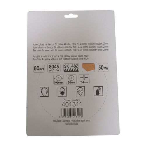 | Nazwa produktu | Tarcza do piły TOPTRADE, do drewna, z płytkami widiowymi, 48 zębów, 190 x 2,4 x 30/20 mm |