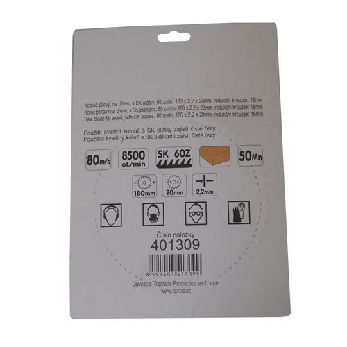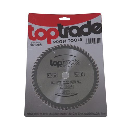 | Nazwa produktu | Tarcza do piły TOPTRADE, do drewna, z płytkami widiowymi, 60 zębów, 180 x 2,2 x 20/16 mm |