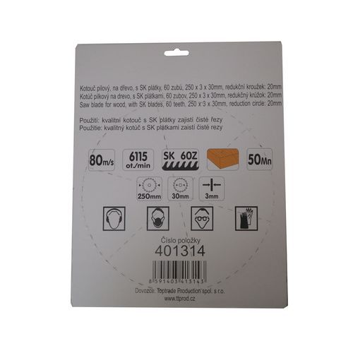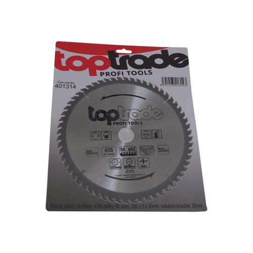 | Nazwa produktu | Tarcza do piły TOPTRADE, do drewna, z płytkami widiowymi, 60 zębów, 250 x 3 x 30/20 mm |