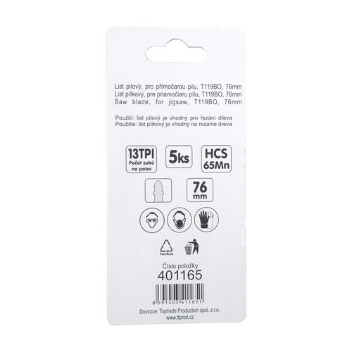 | Nazwa produktu | TOPTRADE brzeszczot do wyrzynarki, T119BO, 76 mm, drewno, opakowanie 5 szt. |