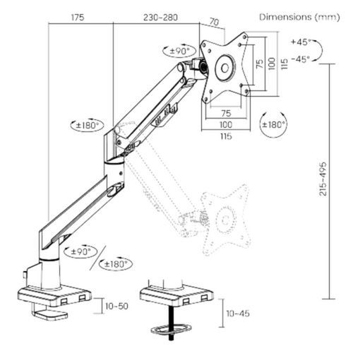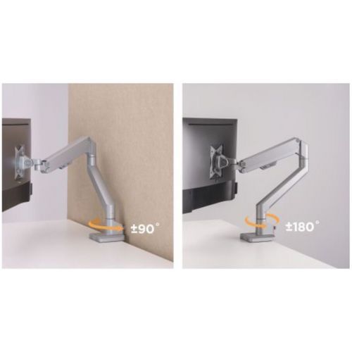 Uchwyt umożliwia łatwą regulację wysokości, regulację pochylenia monitora +/-45°, odchylenia na boki o 180° i obrotu monitora o 360°, dzięki czemu można łatwo znaleźć optymalną pozycję na potrzeby wygodnego i ergonomicznego użytkowania.