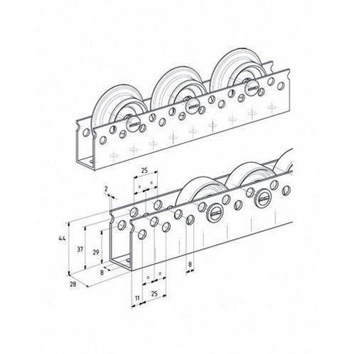 Listwy z pojedynczymi rolkami z łożyskiem ślizgowym. Służą jako uniwersalne elementy przenośników transportowych, linii montażowych, pochyłych regałów czy pochylni. Profil w kształcie litery „U” z blachy ocynkowanej. Otwory na dolnej listwie profilu umożliwiają mocowanie do podłogi.