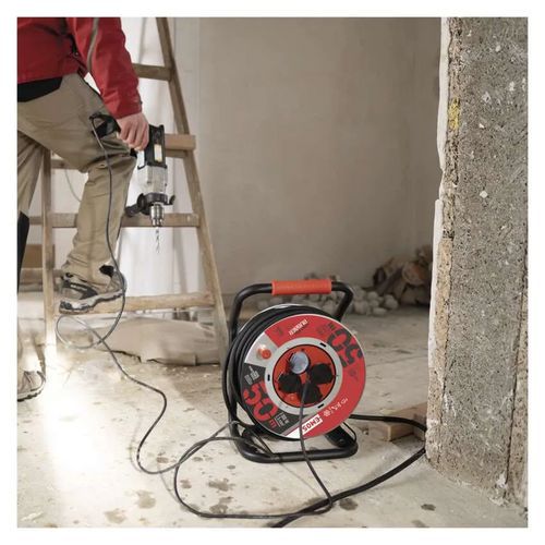 Łatwość nawijania kabla zapewnia ucho prowadzące i solidny metalowy korpus bębna.