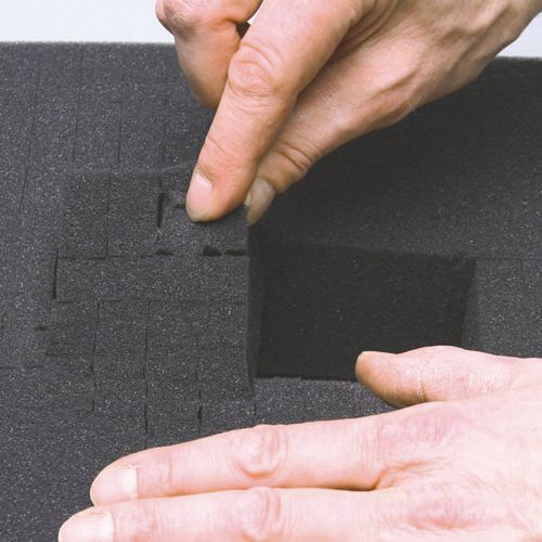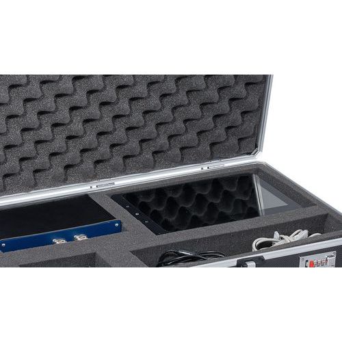 - Wnętrze walizki wypełnione piankowym obicie z perforacją ułatwiającą wyciąganie przyrządów i akcesoriów zależnie od ich kształtu.