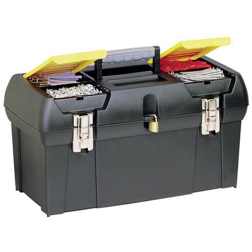 - Plastikowe walizki na narzędzia. Wyposażony w organizery w pokrywie na drobne części i materiał. Składana rączka ułatwia transport.
