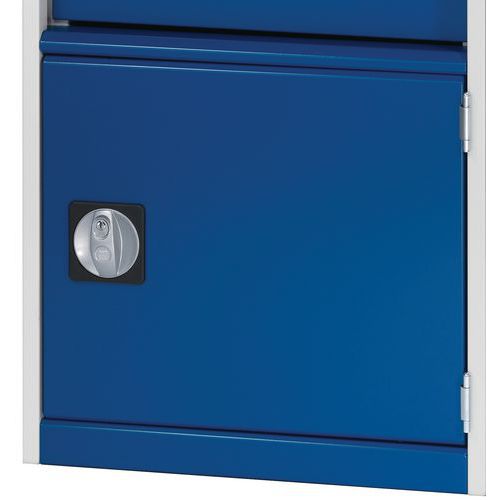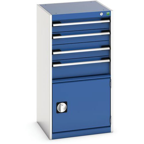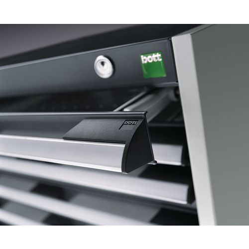 Szafki szufladowe Bott Cubio z szufladami o nośności 75 kg i 100% wysuwem na łożyskach rolkowych. Drzwi szafy z perforowaną stroną wewnętrzną do przechowywania narzędzi. Solidna spawana konstrukcja stalowa o nośności do 1,5 tony, malowana proszkowo wykończenie. Centralny zamek blokujący otwarcie kilku szuflad jednocześnie. Ergonomiczne uchwyty z listwą zapisową, zamykane na zamek bębenkowy z dwoma kluczami.