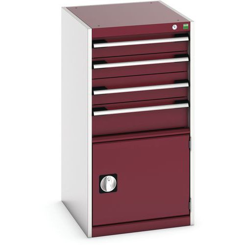 Warsztatowa szafka z szufladami Bott Cubio, 100 x 52,5 x 65 cm, 4 szuflady, 1 szafka, szaro-czerwona